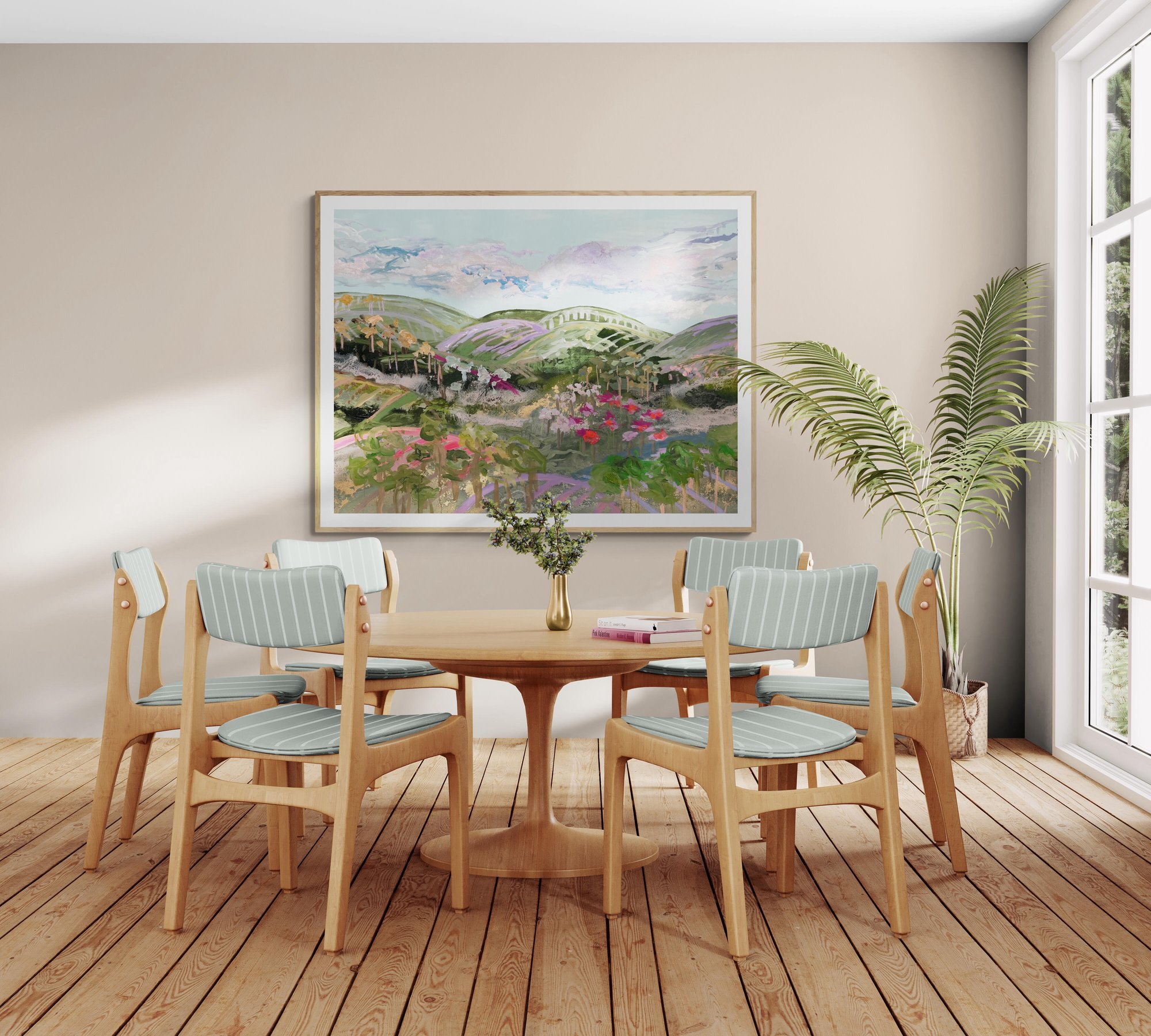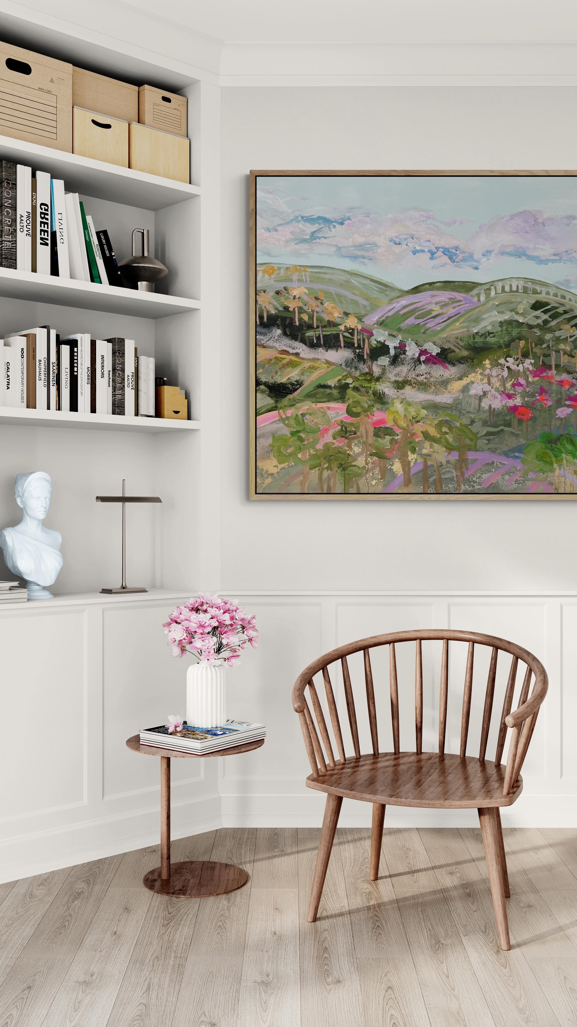Mixed media, framed in light wood raw tray. (for more photos of the exact frame please email [email protected] as these images are with mock up frame)