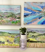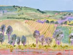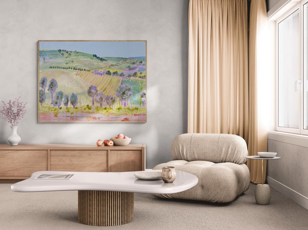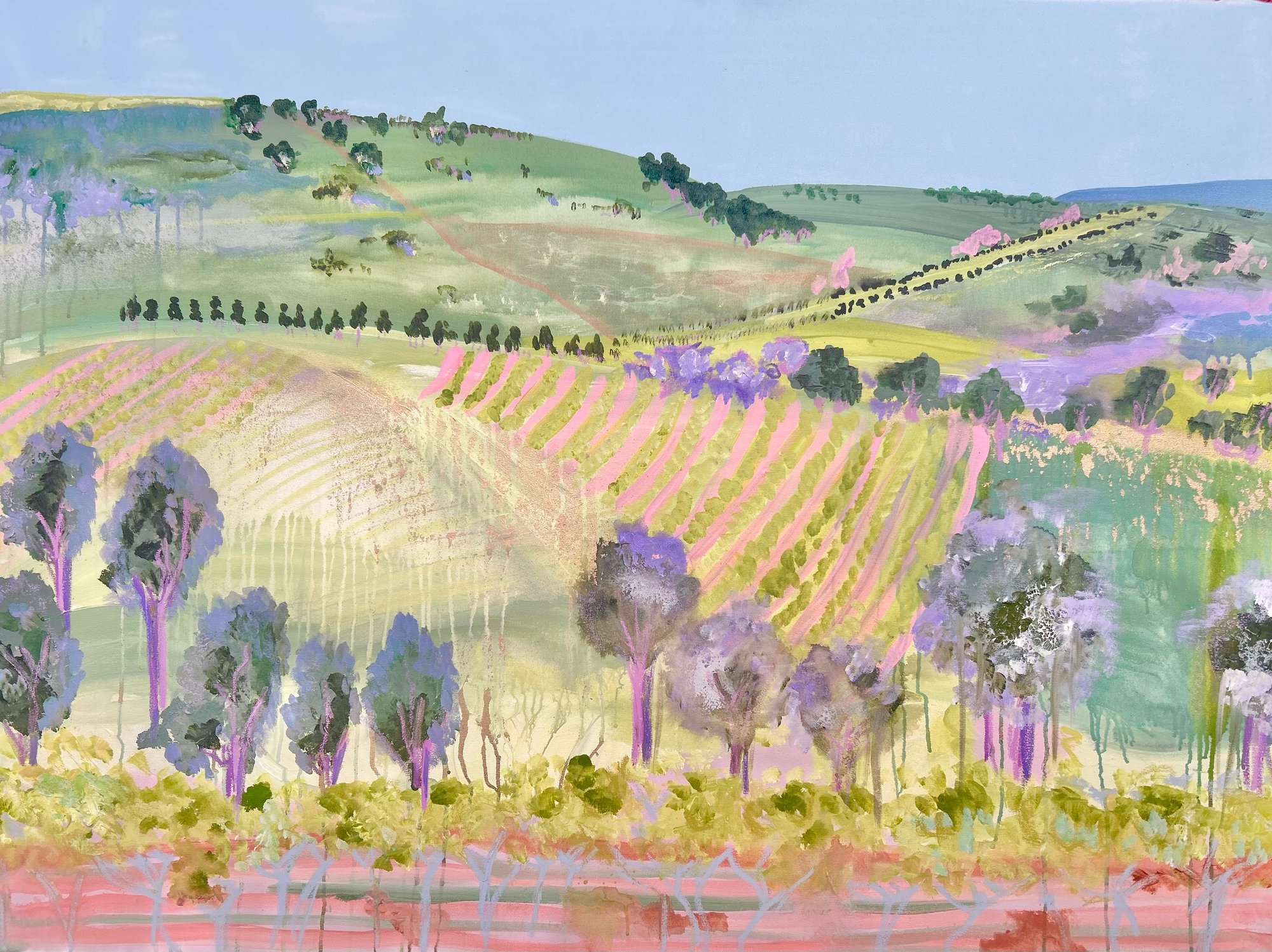 A harmonious blend of pastel tones, capturing the serenity of the Barossa hillside vineyards with a playful gingham accent in the foreground. The soft, sunlit hues invite you to stroll through the rows of vines and soak in the peaceful charm of this iconic landscape.