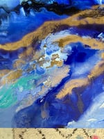 Golden Currents captures the mesmerizing dance of water and light through bold strokes of deep blues, turquoise, and shimmering gold. Fluid forms flow across the canvas like aerial views of rushing rivers or ocean currents, where precious metals have been swept along by nature’s force. The interplay between cool blues and warm golden veins creates a sense of movement and energy, inviting viewers to lose themselves in the painting’s dynamic rhythm. This piece embodies the raw power and beauty of natural elements in motion, where earth and water converge in an eternal dance.
