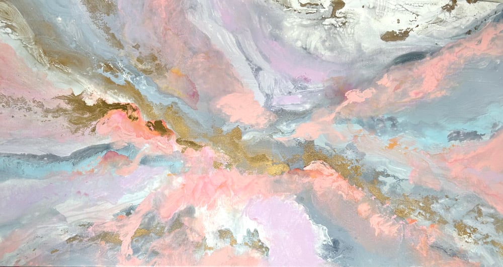 ‘Whispered Skies’ captures the gentle poetry of dawn breaking through morning clouds. This ethereal composition flows with soft coral pinks, misty grays, and touches of golden light, creating an atmospheric dreamscape that feels both grounded and weightless. The painting’s fluid movements suggest wind-swept clouds drifting across an endless sky, where whispers of color blend and separate like secrets shared between earth and heaven.
